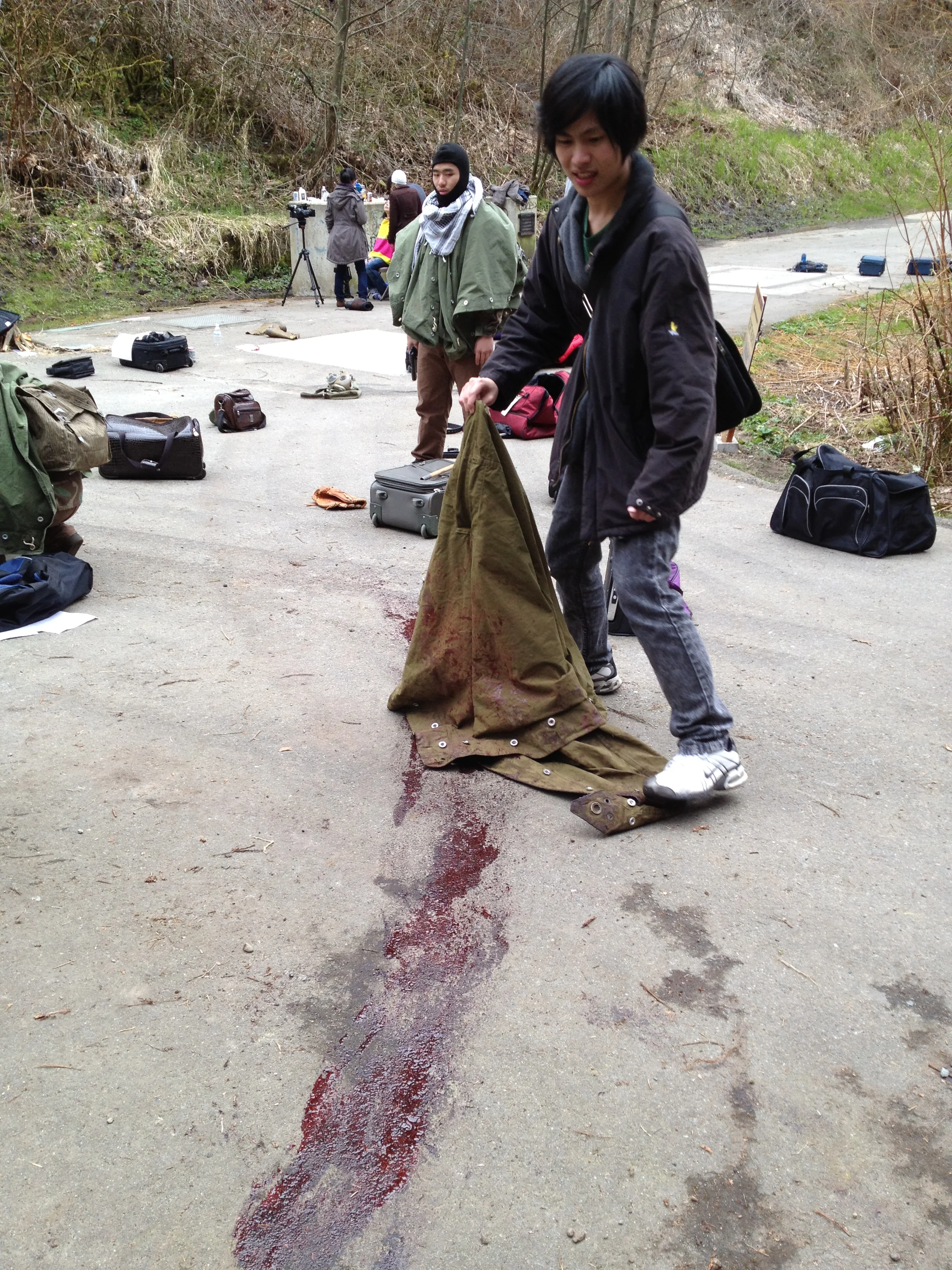 Curtis Anzai, our beloved "corpse", lugging his dry suit and costume up out of the creek where he spent nearly 3 hours submerged in icy waters.